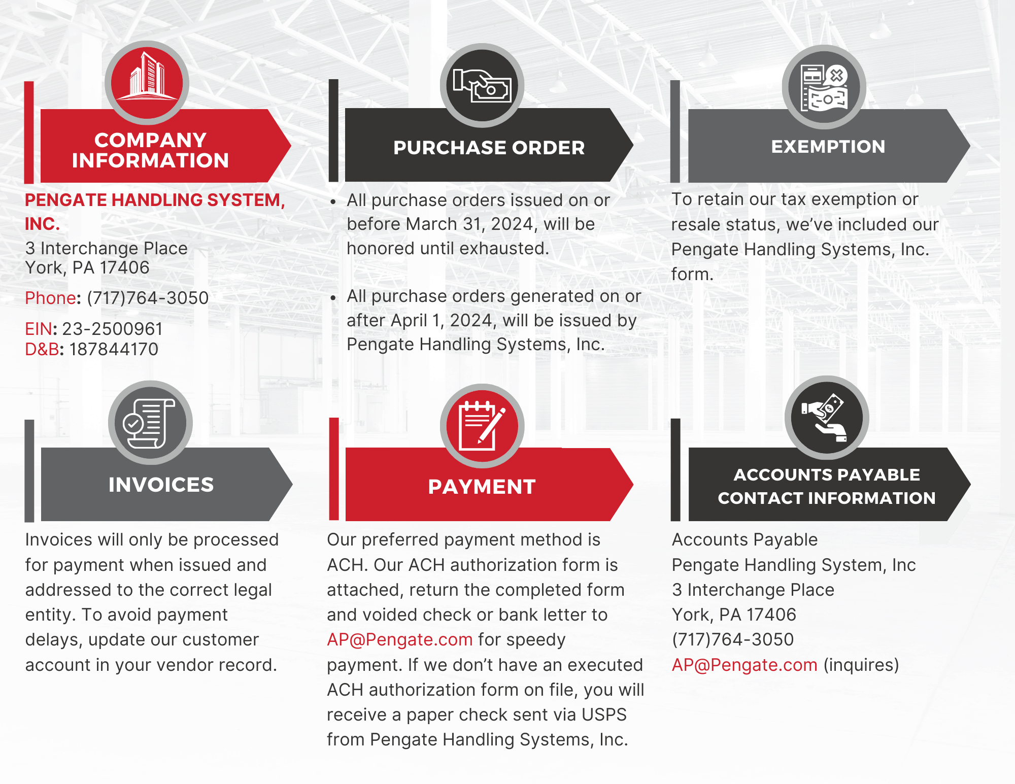To learn more about our transformation, visit the Pengate site www.Pengate.com. If you have questions, please contact us through your current Arbor Material Handling, Inc./Pengate Handling Systems of New York, Inc. contact or send an email to [email protected].