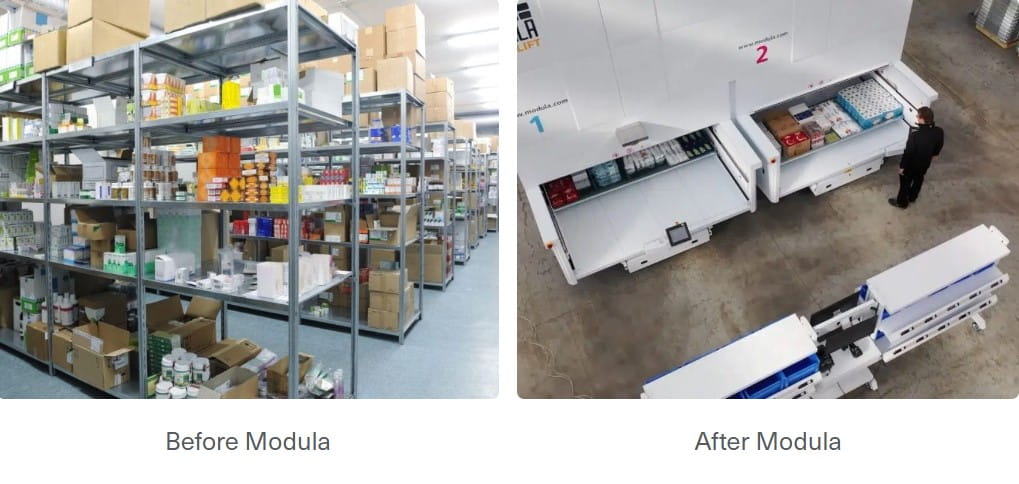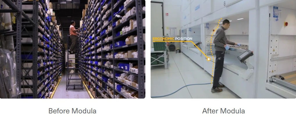 Modula Vertical Life Modules (VLMs) are fully automated vertical storage systems that take up a minimum footprint by utilizing the ceiling height available.